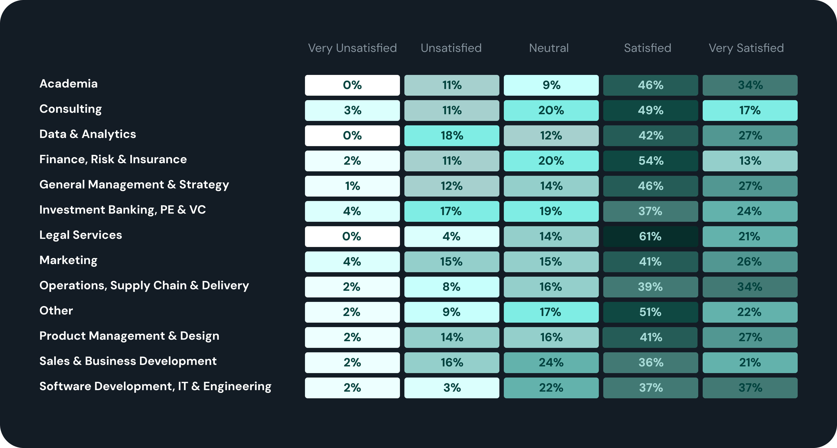 Satisfaction peaks in Operations (85%), Legal (82%), Academia (80%), and Software (74%). Sales/BD, Investment Banking, Marketing, and Data show higher dissatisfaction, while Consulting and Finance sit in the middle with ~13–14% unhappy